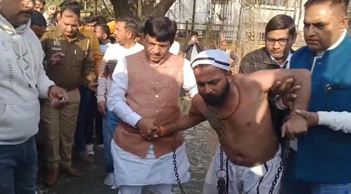 मुज़फ्फरनगर। शहर के परिक्रमा मार्ग की जर्जर हालत से परेशान एक युवक ने गुरुवार को अनोखे तरीके से विरोध दर्ज कराया। विजय हिंदुस्तानी नामक युवक ने सड़क पर भरे गंदे पानी में उतरकर ‘जल-विरोध’ किया और अधिकारियों की उदासीनता पर सवाल खड़े किए। युवक ने बेड़ियां पहनकर प्रदर्शन किया, ताकि लोगों और प्रशासन का ध्यान समस्या की गंभीरता की ओर खिंच सके।