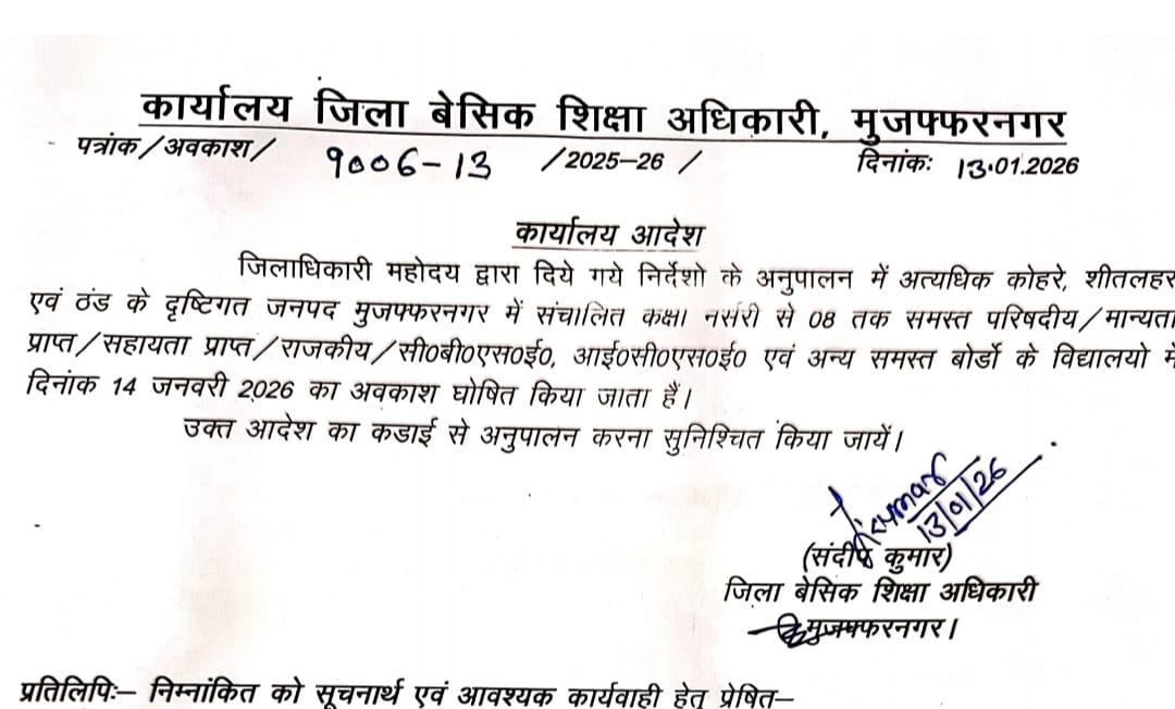 मुज़फ्फरनगर। जनपद में लगातार बढ़ रही ठंड, शीतलहर और कोहरे को देखते हुए प्रशासन ने स्कूली बच्चों के हित में बड़ा निर्णय लिया है। जिला बेसिक शिक्षा अधिकारी कार्यालय द्वारा जारी आदेश के अनुसार जनपद मुज़फ्फरनगर में संचालित कक्षा नर्सरी से लेकर कक्षा 8 तक के सभी परिषदीय, मान्यता प्राप्त, सहायता प्राप्त, राजकीय एवं सीबीएसई, आईसीएसई सहित अन्य सभी बोर्डों के विद्यालयों में दिनांक 14 जनवरी 2026 (बुधवार) को अवकाश घोषित किया गया है।