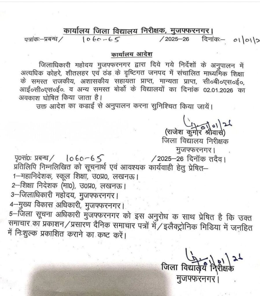 मुजफ्फरनगर, 1 जनवरी 2026: कड़ाके की सर्दी, अत्यधिक कोहरा और शीतलहर की स्थिति को देखते हुए जिलाधिकारी मुजफ्फरनगर के निर्देश पर जनपद के सभी माध्यमिक विद्यालयों में 2 जनवरी 2026 को अवकाश घोषित किया गया है। इस संबंध में जिला विद्यालय निरीक्षक राजेश कुमार श्रीवास्तव द्वारा आदेश जारी किया गया है।