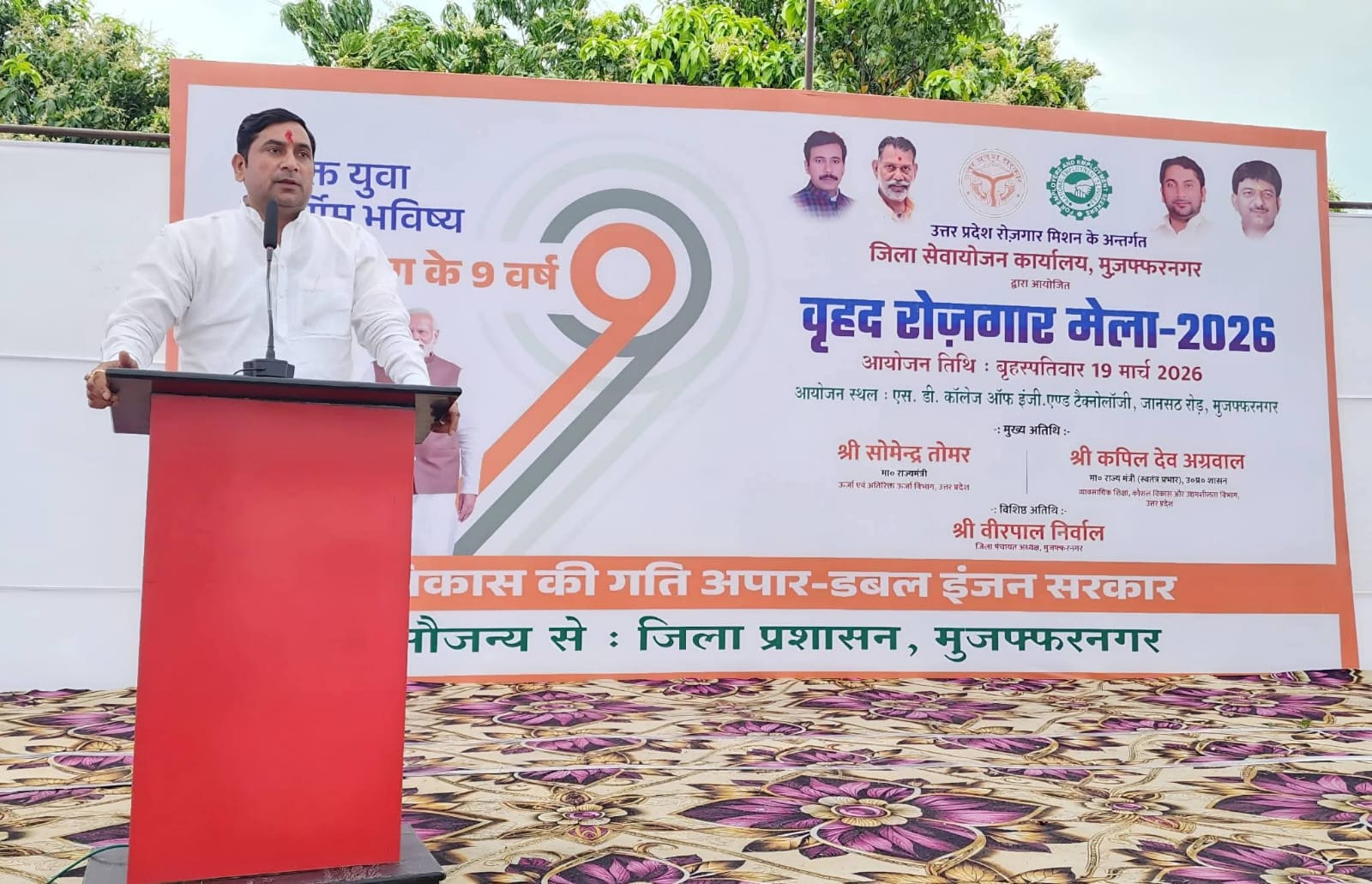 मुजफ्फरनगर, 19 मार्च 2026। उत्तर प्रदेश सरकार के नौ वर्ष पूर्ण होने के उपलक्ष में जनपद में वृहद रोजगार मेले का आयोजन जानसठ रोड स्थित एस.डी. कॉलेज ऑफ इंजीनियरिंग एंड टेक्नोलॉजी परिसर में किया गया। जिला सेवायोजन कार्यालय के सहयोग से आयोजित इस मेले में 2047 युवाओं ने प्रतिभाग किया, जिनमें से अपराह्न 3 बजे तक 1072 अभ्यर्थियों का प्रारंभिक चयन विभिन्न प्रतिष्ठित कंपनियों द्वारा किया गया।