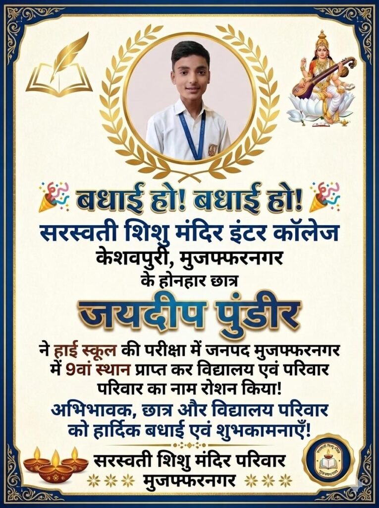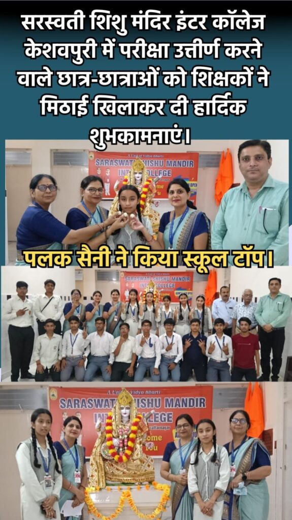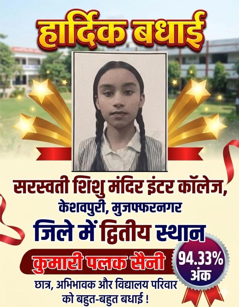 मुजफ्फरनगर, केशवपुरी। शिक्षा के क्षेत्र में उत्कृष्टता का एक और उदाहरण प्रस्तुत करते हुए सरस्वती शिशु मंदिर इंटर कॉलेज, केशवपुरी के विद्यार्थियों ने यूपी बोर्ड परीक्षा परिणाम में शानदार सफलता हासिल की है। इंटरमीडिएट और हाईस्कूल दोनों ही वर्गों में विद्यार्थियों के उत्कृष्ट प्रदर्शन ने न केवल विद्यालय, बल्कि पूरे जिले का मान बढ़ाया है। परिणाम घोषित होते ही विद्यालय परिसर में उत्साह और गर्व का माहौल देखने को मिला।