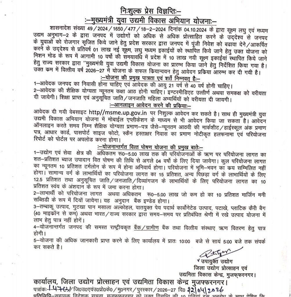 मुजफ्फरनगर। प्रदेश सरकार द्वारा युवाओं को आत्मनिर्भर बनाने और जनपद में उद्योगों को बढ़ावा देने के उद्देश्य से मुख्यमंत्री युवा उद्यमी विकास योजना को प्रभावी रूप से लागू कर दिया गया है। सूक्ष्म, लघु एवं मध्यम उद्यम विभाग के माध्यम से संचालित इस योजना के तहत वित्तीय वर्ष 2026-27 के लिए आवेदन प्रक्रिया शुरू हो चुकी है। योजना का मुख्य उद्देश्य अधिक से अधिक युवाओं को स्वरोजगार से जोड़ना और जिले में नई सूक्ष्म इकाइयों की स्थापना को गति देना है। सरकार ने इस योजना को मिशन मोड में लागू करते हुए आगामी दस वर्षों में प्रदेश में 10 लाख नई सूक्ष्म इकाइयों की स्थापना का लक्ष्य निर्धारित किया है, जिससे स्थानीय स्तर पर बड़े पैमाने पर रोजगार सृजन की संभावना जताई जा रही है।